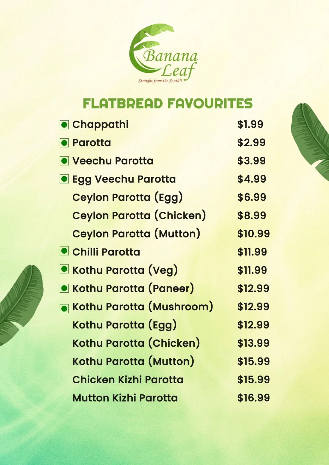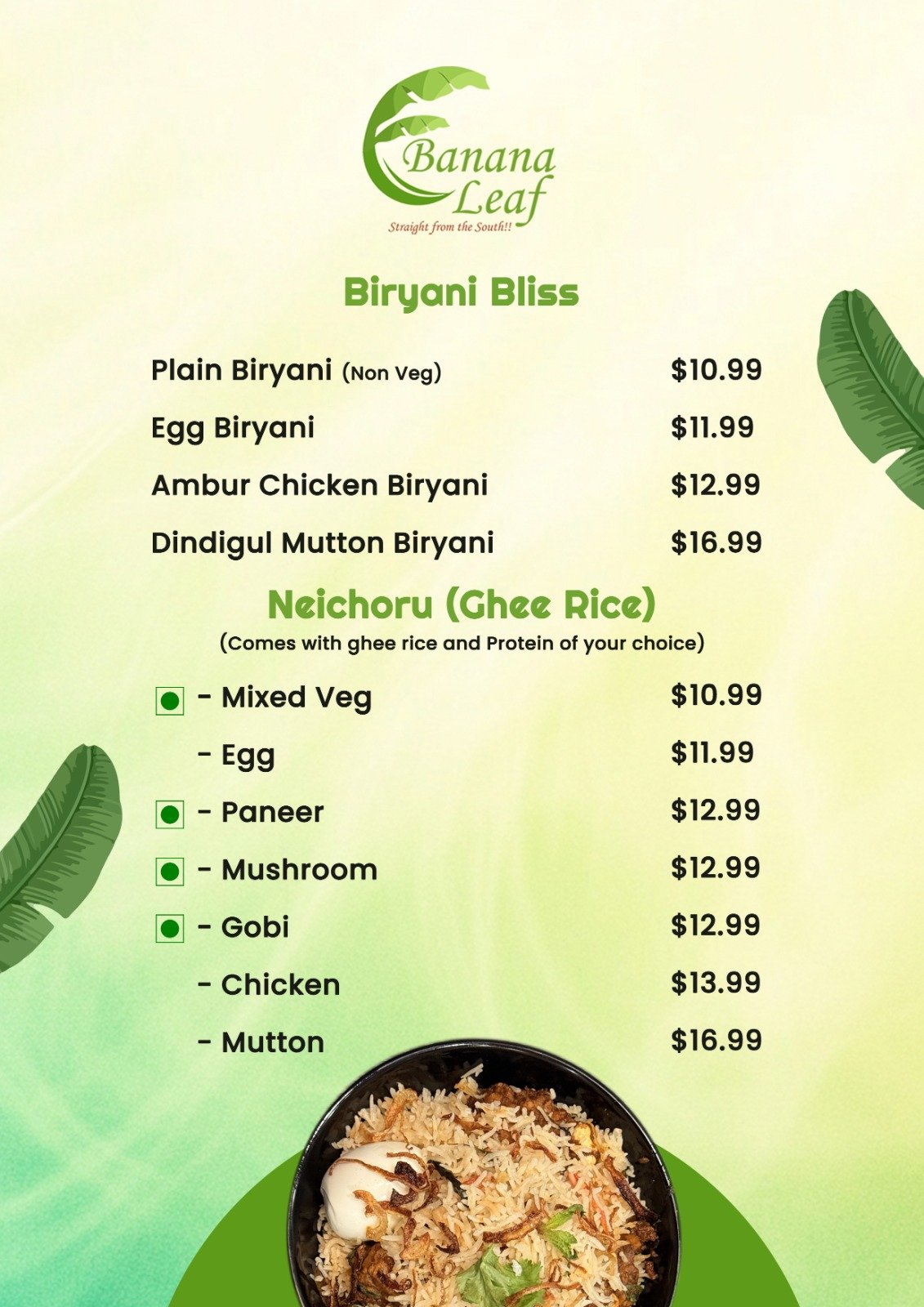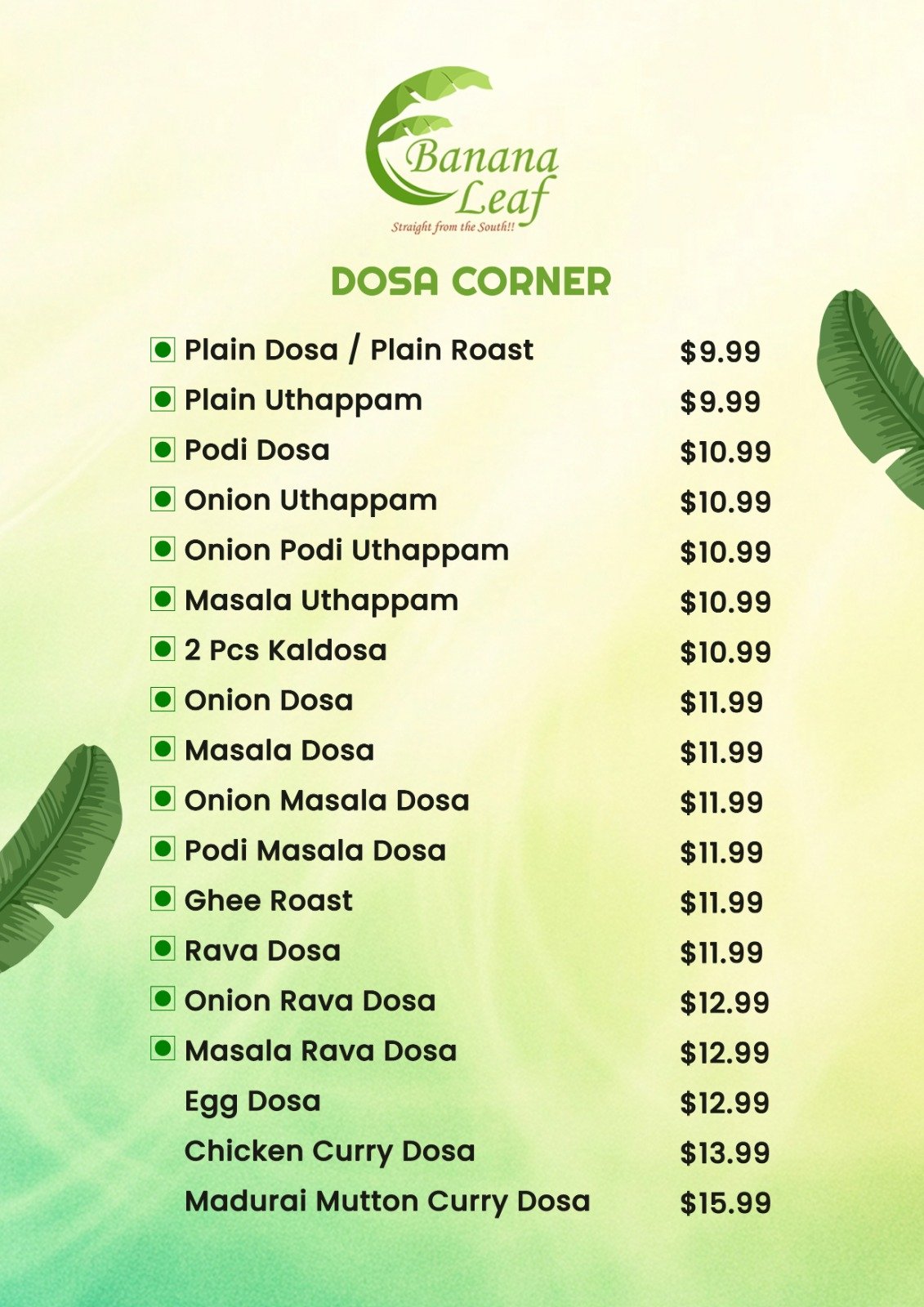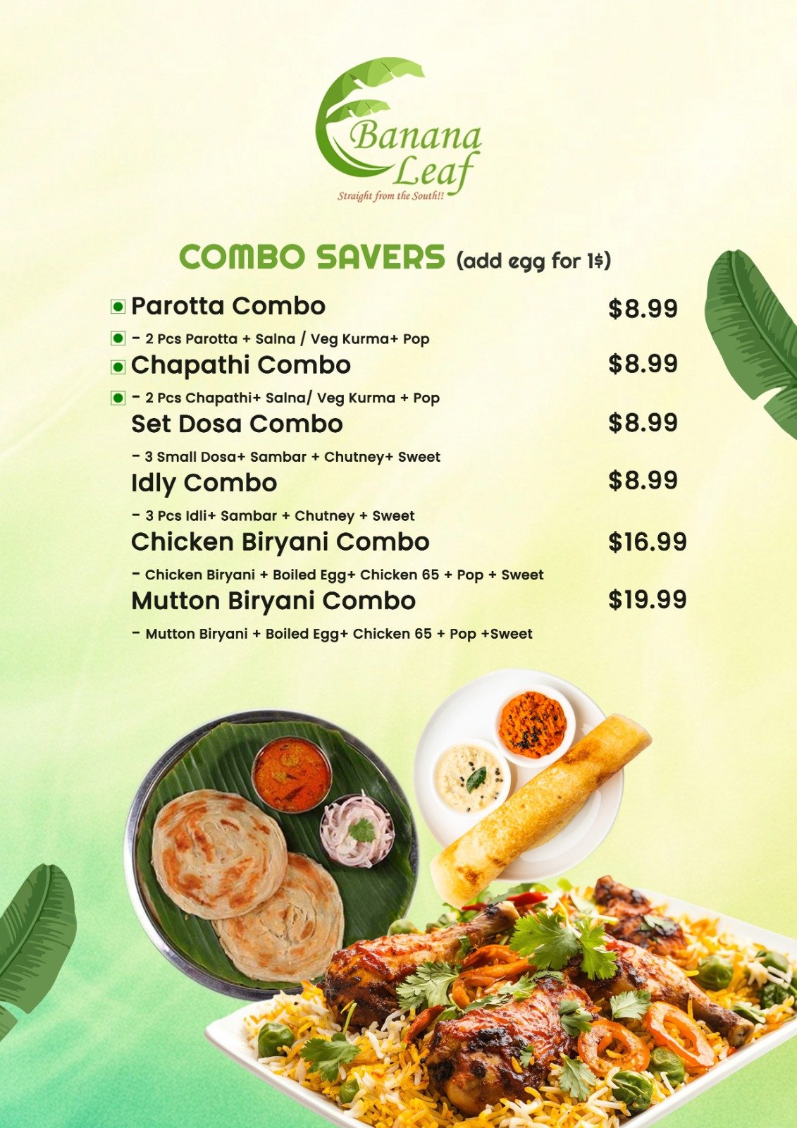 Where authentic South Indian tradition meets Canadian hospitality. As a beloved part of the Oshawa community, we bring you the vibrant, spice-infused flavors of Tamil Nadu and Kerala through generations-old recipes served on fresh banana leaves. From crispy golden dosas and flaky parottas to aromatic biryanis and rich Chettinad curries, every dish is crafted with care, quality ingredients, and a touch of home.